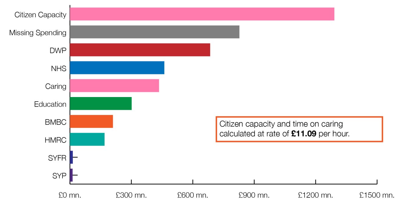 But we can also calculate the enormous positive contribution already made by citizens as carers, which is £435 million. Further, we can also estimate the latent capacity of citizens at £1.3 billon. In other words citizens can contribute directly just as much as public services combined.
